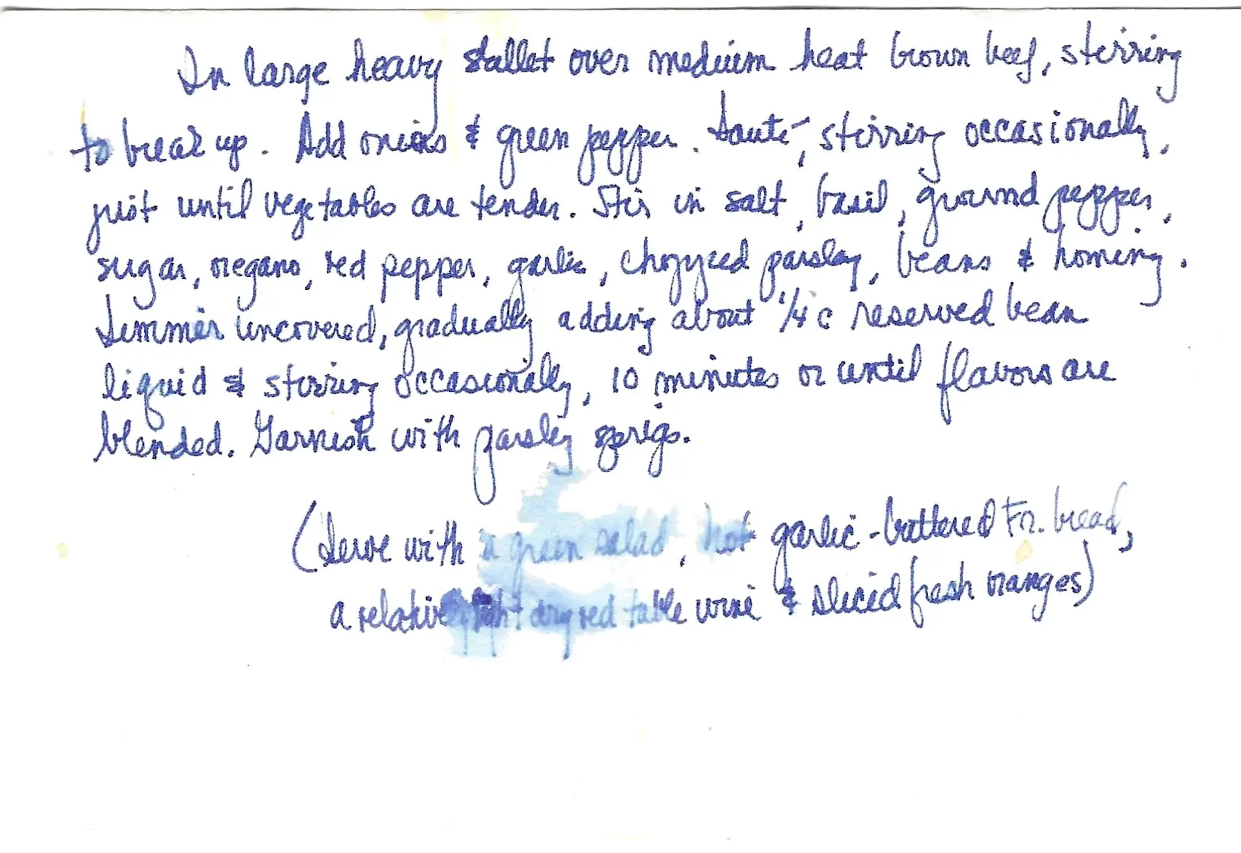 1. In large heavy skillet over medium heat brown beef, stirring to break up. 2. Add onions & green pepper. Sauté, stirring occasionally, just until vegetables are tender. 3.s Stir in salt, basil, ground pepper, sugar, oregano, red pepper, garlic, chopped parsley, beans & hominy. 4.s Simmer uncovered, gradually adding about C reserved bean liquid & stirring occasionally, 10 minutes or until flavors are blended. (If using fresh basil, stir in just before serving & heat through). 5.s Garnish with parsley sprigs.