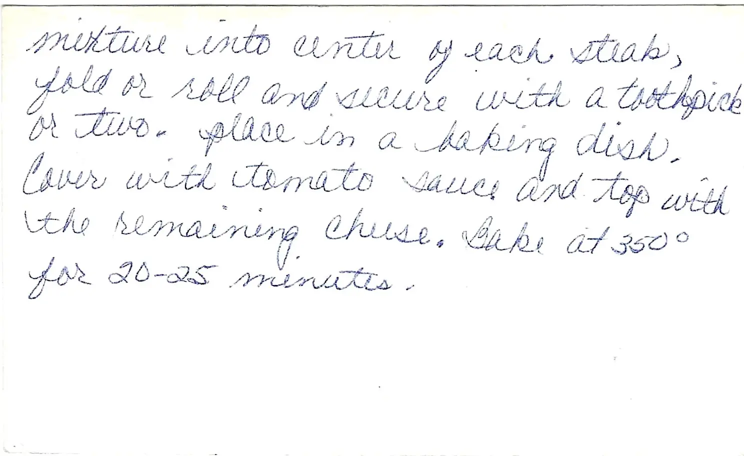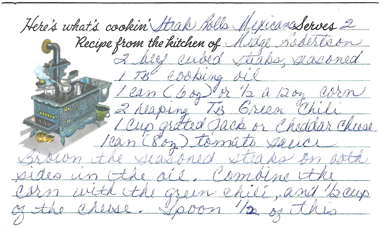 1. Preheat the oven to 350°F. 2. In a skillet, brown the seasoned steaks on both sides in the cooking oil. 3.s In a small bowl, combine the corn, green chili, and half of the grated cheese. 4. Spoon half of this corn mixture into the center of each browned steak. 5. Fold or roll the steaks and secure them with a toothpick or two. 6. Place the steak rolls in a baking dish. 7. Cover the rolls with the tomato sauce. 8. Top with the remaining cheese. 9. Bake for 20-25 minutes.