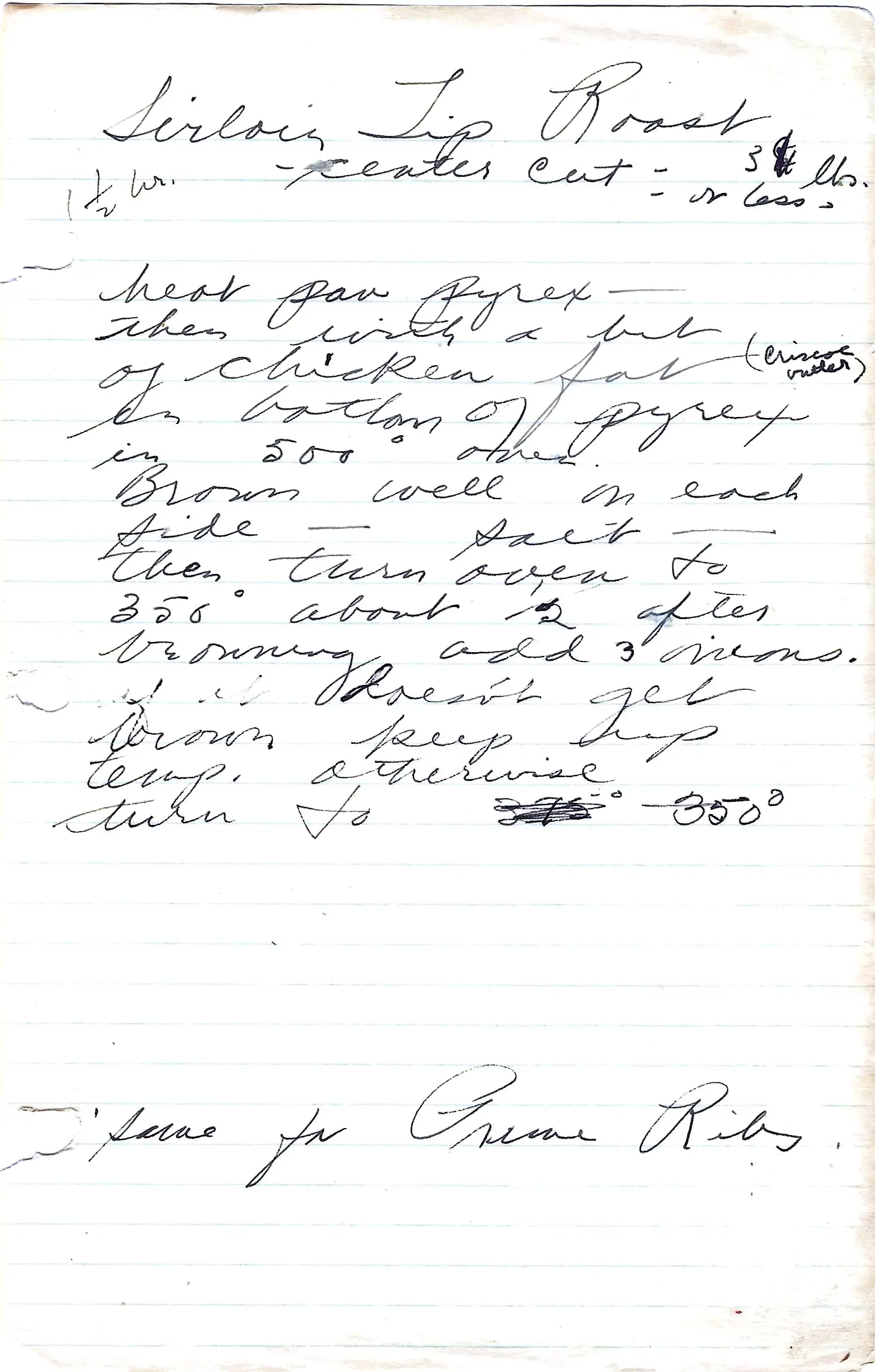 The card has a note: “if it doesn’t get brown keep temp up, otherwise turn to 350°.” It also says this method is the “Same for Prime Ribs.”