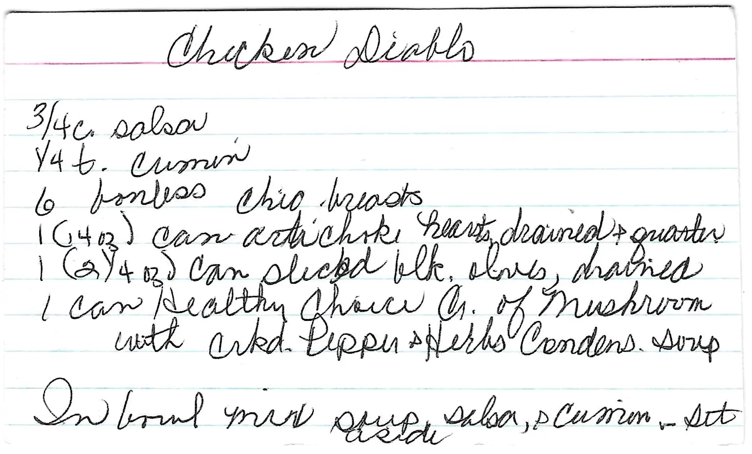 A quick and easy baked chicken dish. Boneless chicken breasts are baked in a creamy, savory salsa-mushroom soup sauce with artichoke hearts, black olives, and cumin.