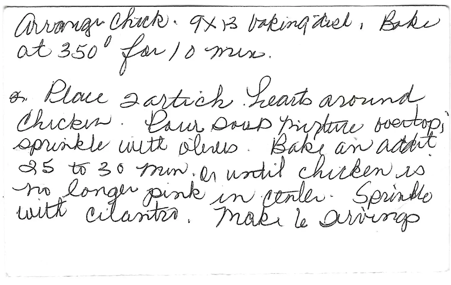 - Arrange chicken in a 9x13 baking dish. Bake at 350° for 10 minutes.