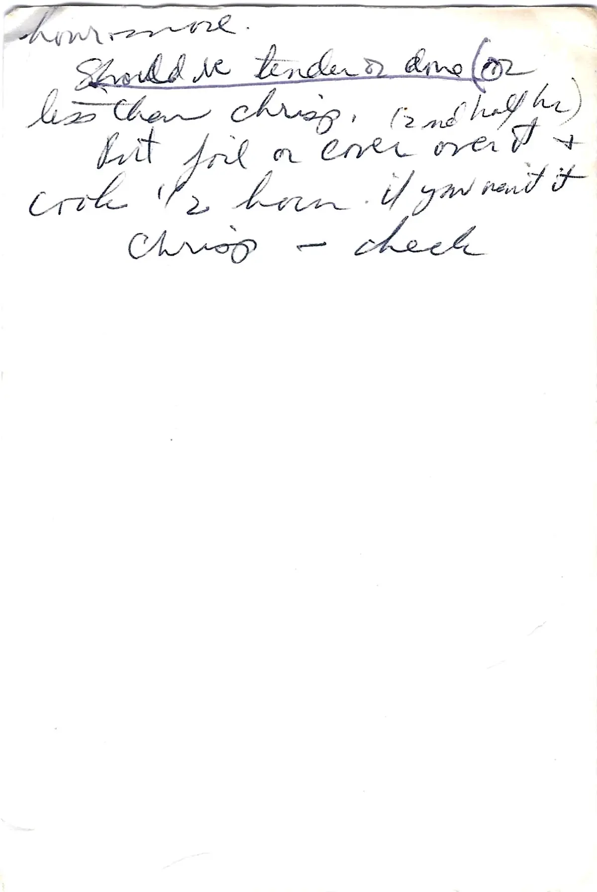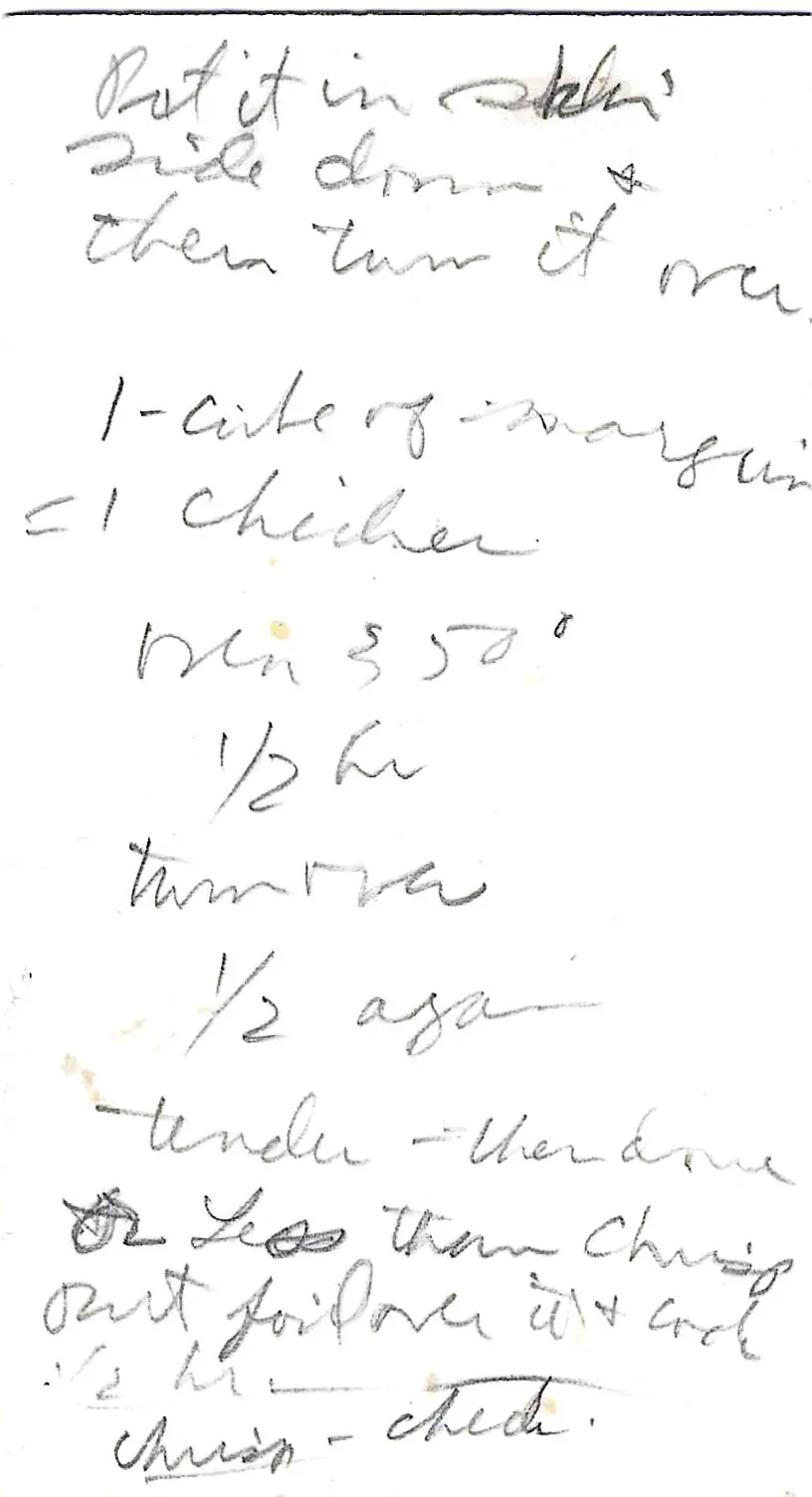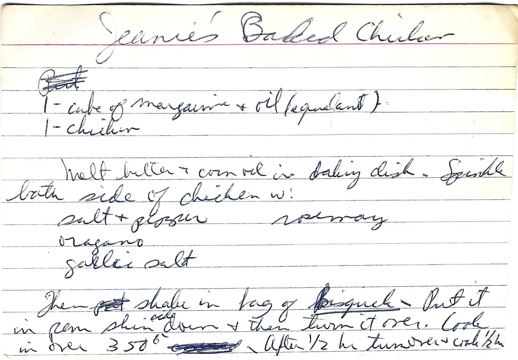 - Continue to cook for about another 30 minutes (“1/2 hour more”), or until the chicken is tender and cooked through. The card notes, “Should be tender or done (or less than crisp, if not half hr).”