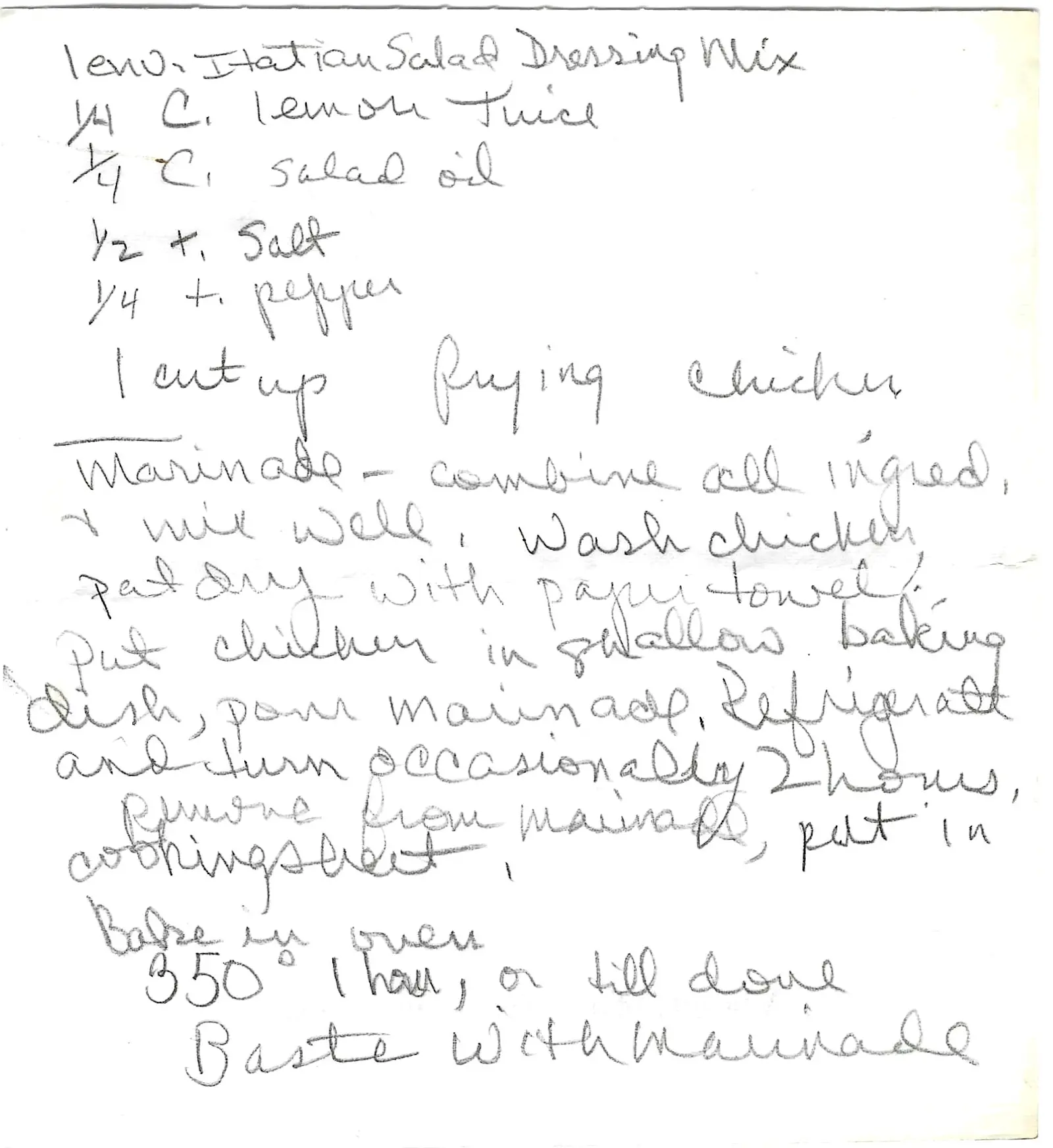 - Combine all marinade ingredients ( cup lemon juice, cup salad oil, teaspoon salt, and teaspoon pepper) and mix well.