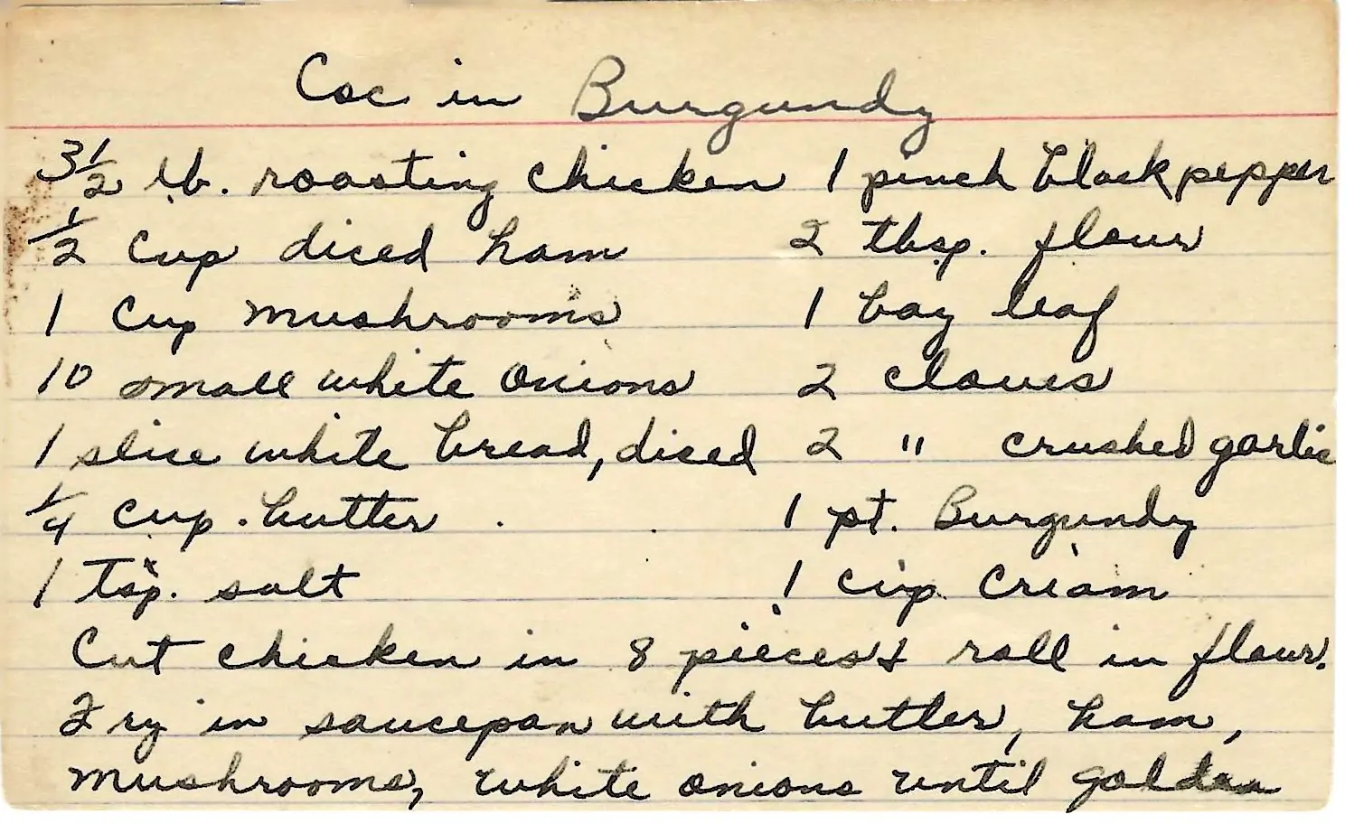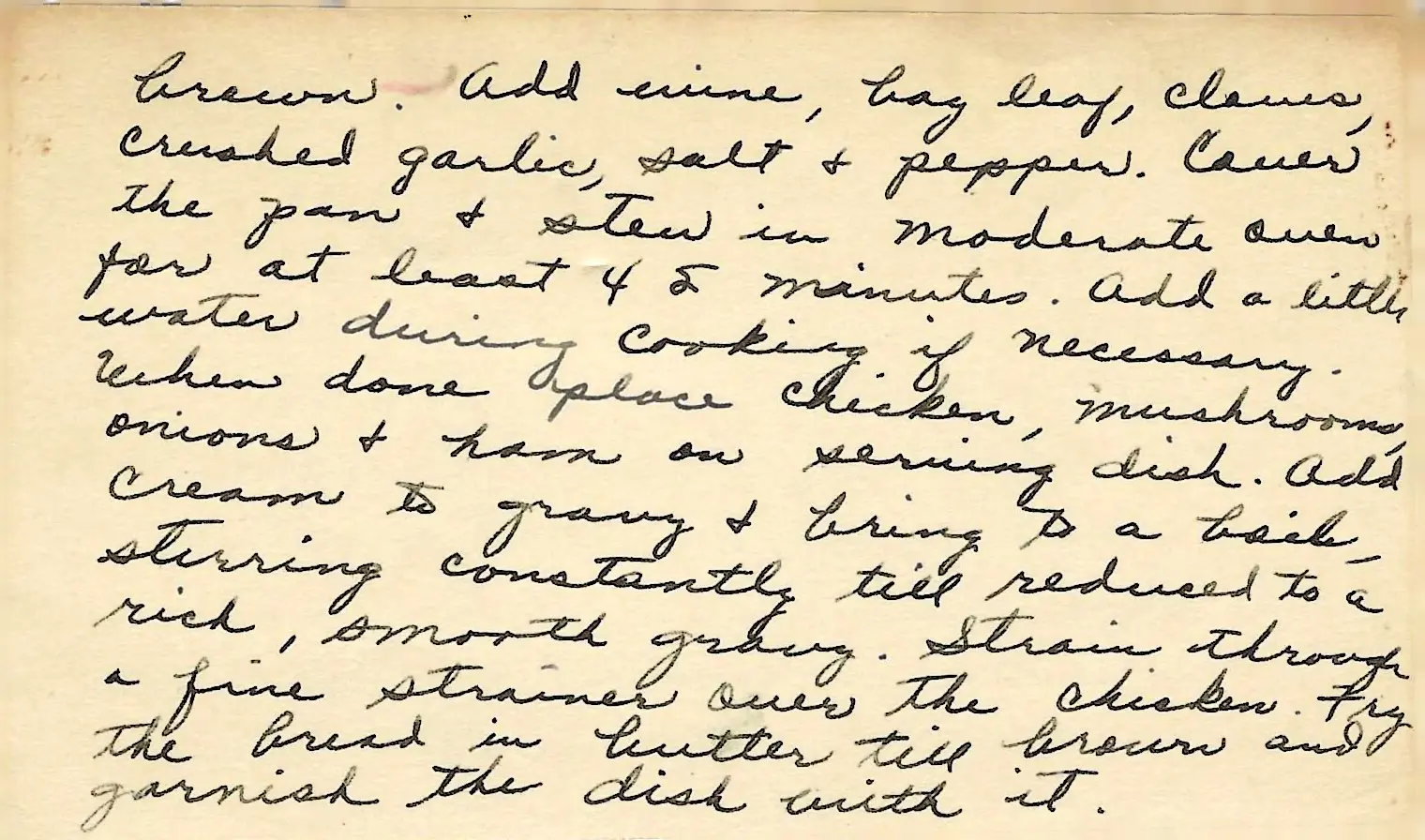 A classic French dish. A roasting chicken is floured and browned, then braised in a 350°F oven with ham, mushrooms, and onions, and finished with a rich, smooth cream gravy.