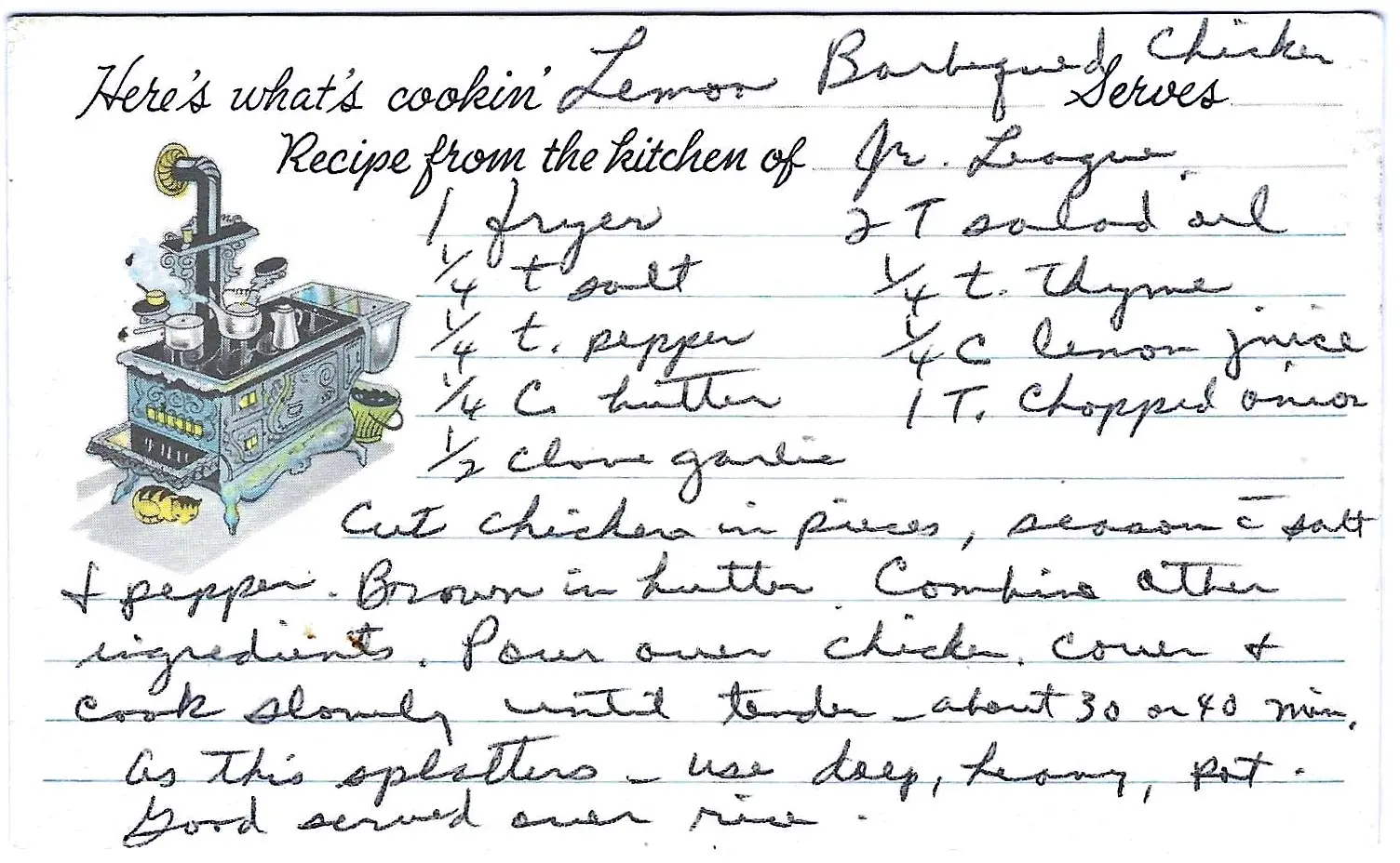 A simple and zesty one-pot chicken dish from the Jr. League. A fryer is cut up, browned, and then simmered until tender in a tangy sauce of lemon juice, butter, onion, garlic, and thyme. Perfect over rice.