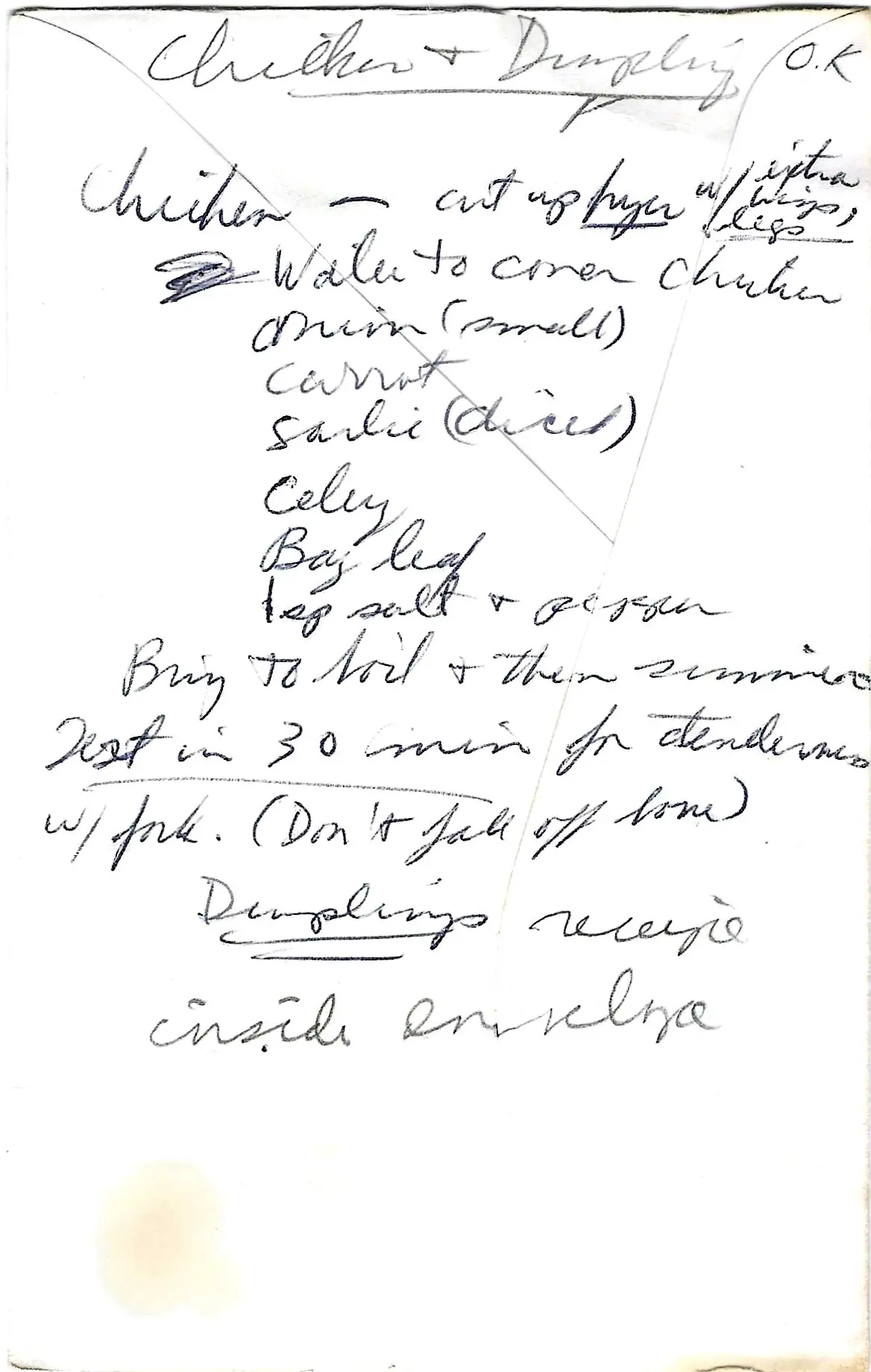 - Bring the defatted chicken broth back to a boil (the card says “add lots of water” which may mean to ensure there’s plenty of boiling liquid).