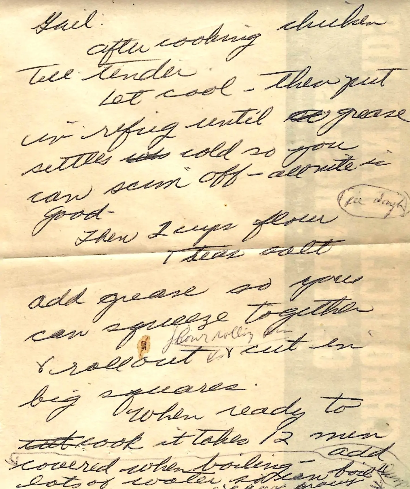 - Add the skimmed chicken grease to the flour mixture. Work the grease in with your hands until you can squeeze the dough together.