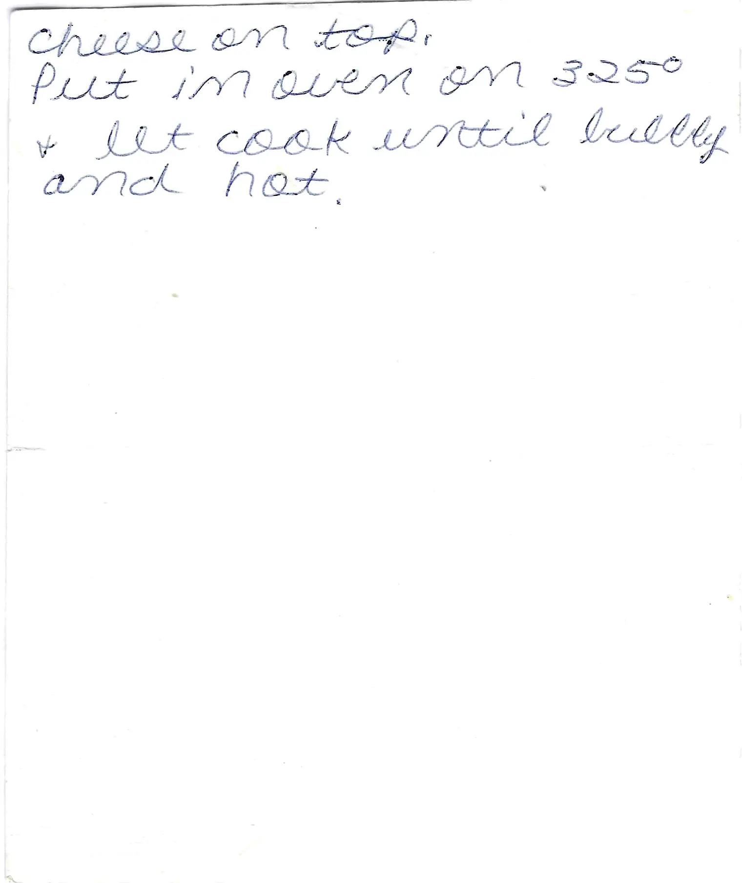 - Put in oven on 325 degrees & let cook until bubbly and hot.