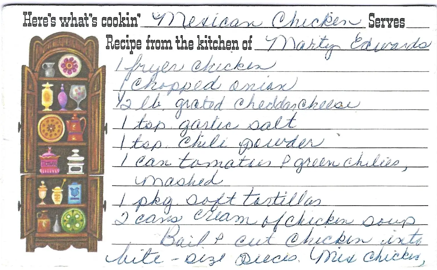 - Mix chicken, chopped onion, 1/2 lb. grated cheddar cheese, 1 teaspoon garlic salt, 1 teaspoon chili powder, 1 can mashed tomatoes & green chilies, 1 package soft tortillas, and 2 cans cream of chicken soup.