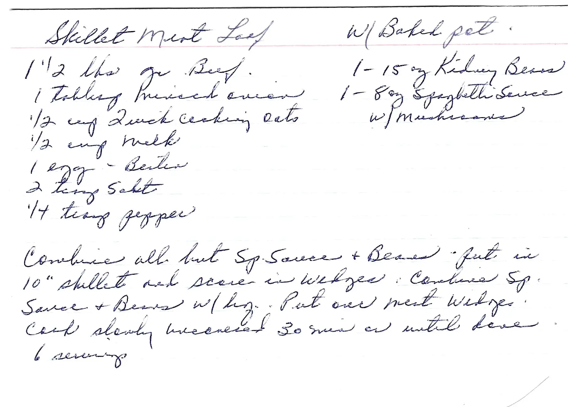 The recipe card suggests serving this dish with a baked potato. This is a quick, one-skillet meatloaf that serves 6.
