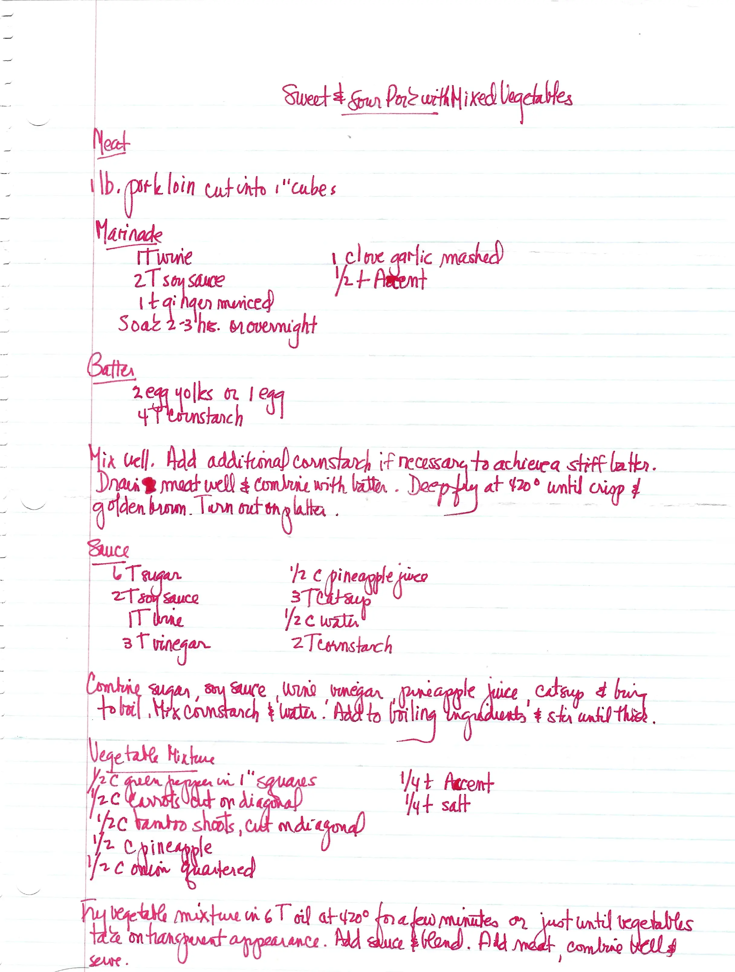 - Add the vegetable mixture (green pepper, carrots, bamboo shoots, pineapple, onion) to the hot oil.