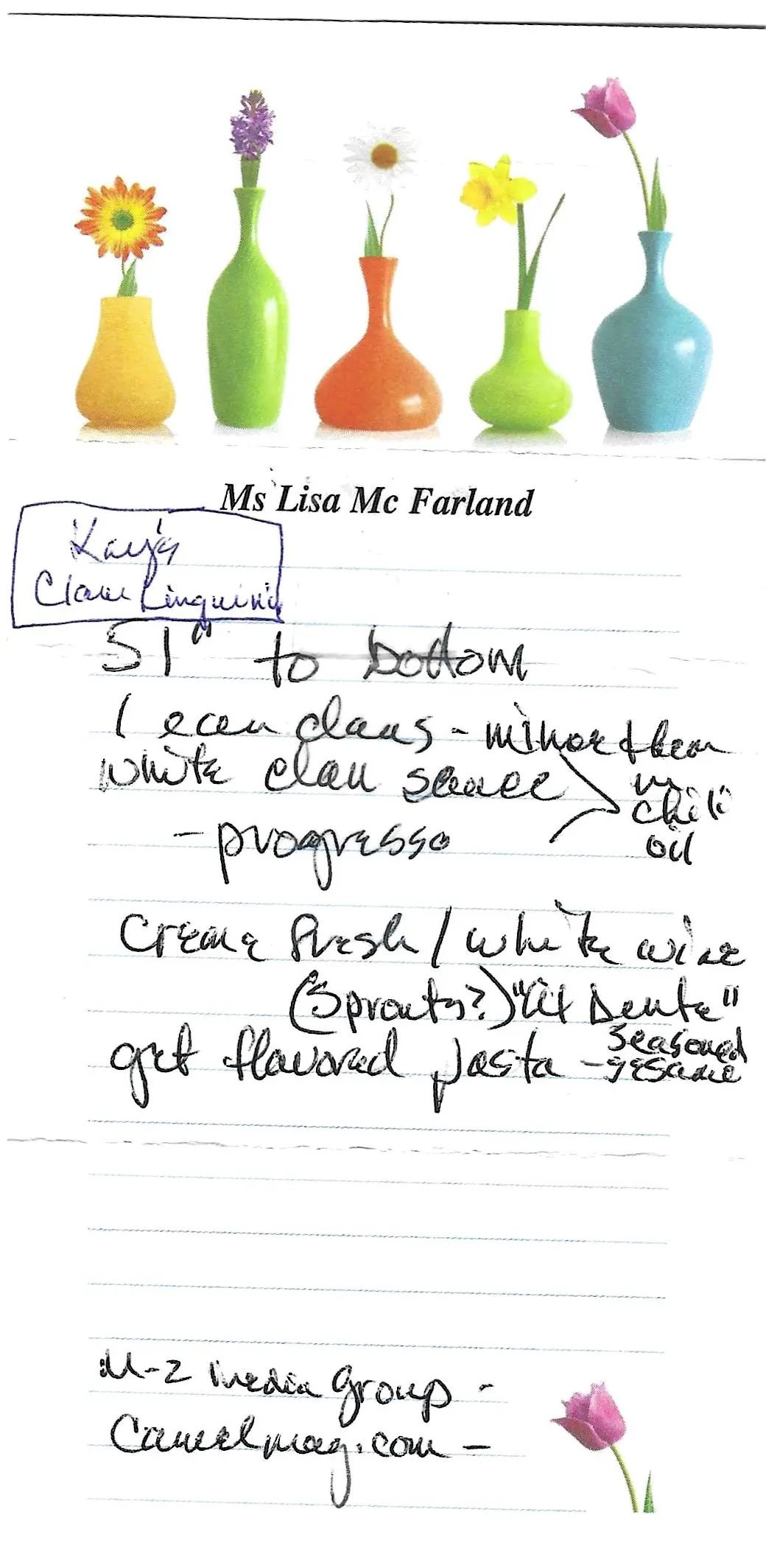 The recipe card is very fragmented. It seems to suggest using a base of “Progresso” brand “white clam sauce.” Other notes like “Sláinte to bottom” are unclear. The card also contains unrelated notes at the bottom: “M-Z Livedin group” and “Carmelmag.com.”