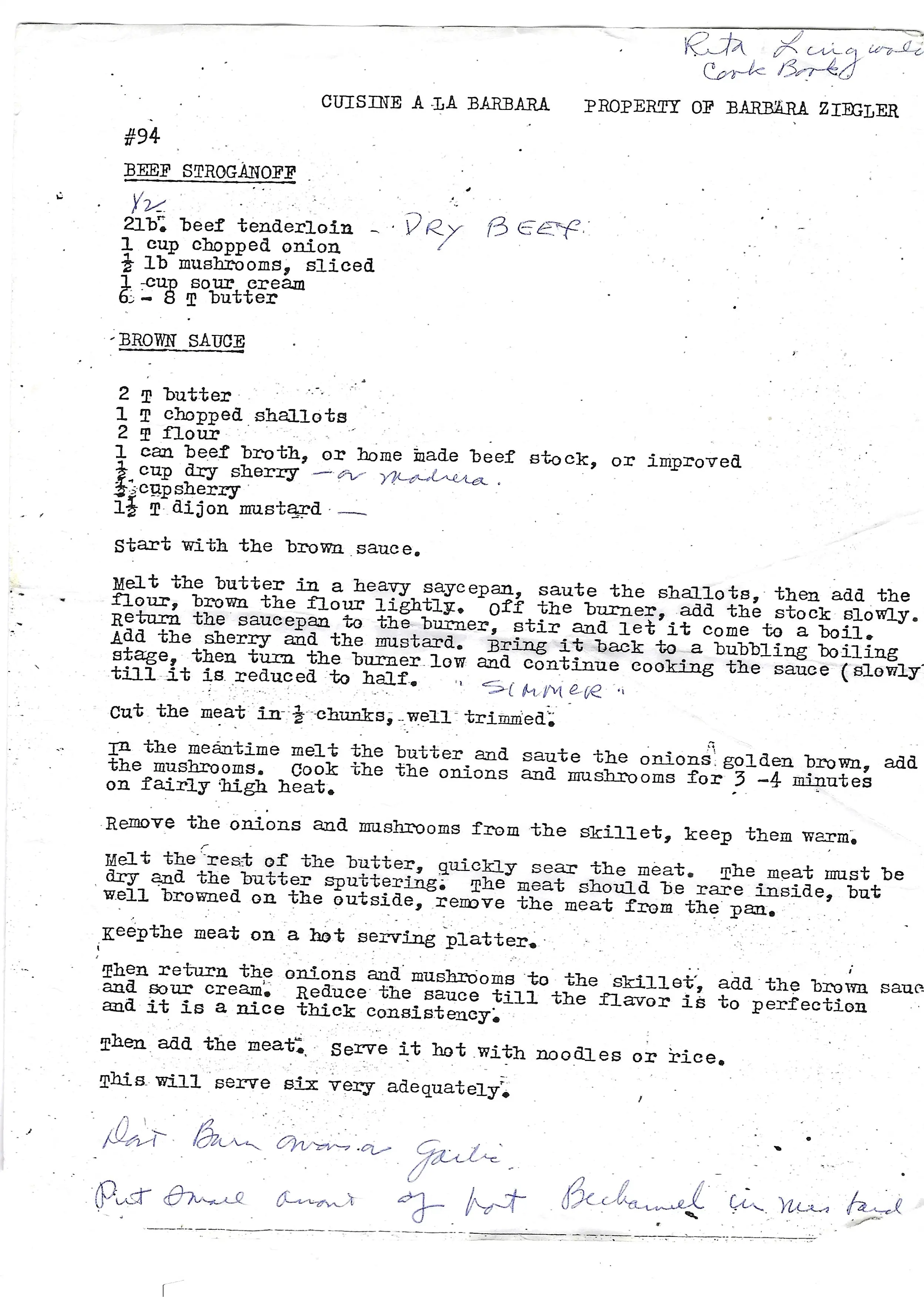 This recipe is #94 from “Cuisine a la Barbara,” property of Barbara Ziegler. The page includes several handwritten annotations: “DRY BEEF” next to the tenderloin, “or madeira” for the sherry, and “SIMMER” to clarify the sauce cooking. An unclear handwritten note at the bottom appears to be a separate tip: “Put Small amount of hot Bechamel in mustard.”