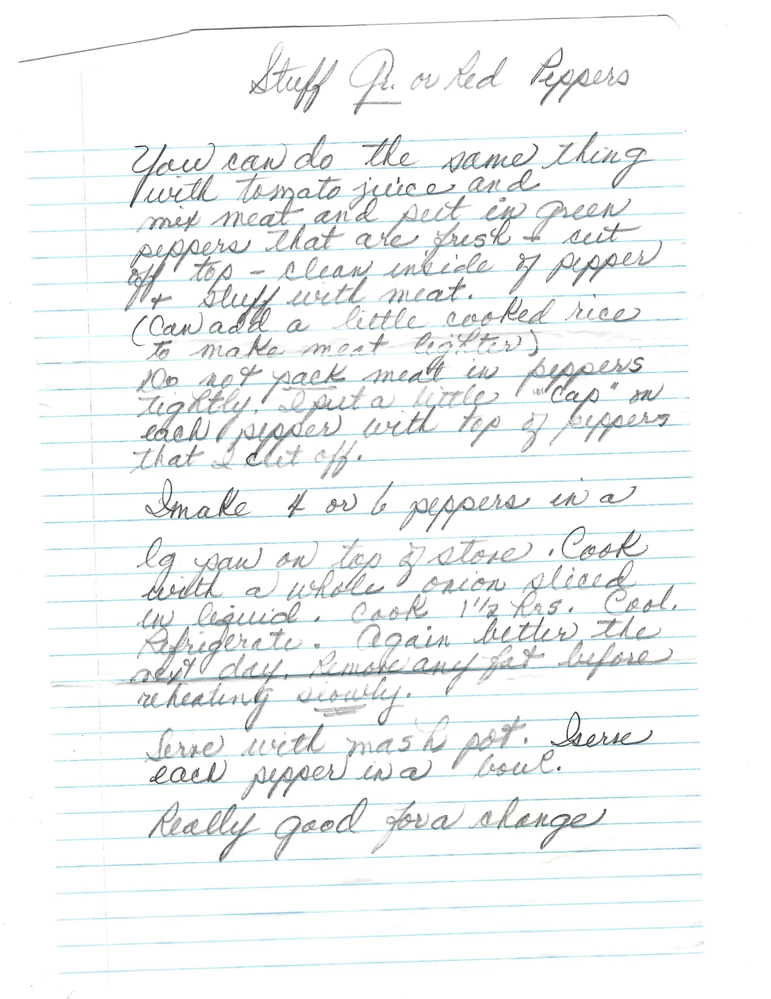 1.s Prepare the meat filling and tomato sauce according to the Cabbage Rolls recipe. For this variation, you can add a little cooked rice to the meat mixture to make it go further. 2.s Wash the peppers. Slice the tops off and set them aside. Remove all seeds and membranes from the inside of the peppers. 3.s Loosely fill each pepper with the meat mixture. Do not pack it in tightly. 4.s Place the reserved pepper tops back onto the stuffed peppers like little “caps.” 5.s Arrange the peppers in a large pot suitable for the stovetop. 6.s Add the sliced onion to the pot and pour the tomato sauce around the peppers. 7.s Cook on the stovetop over low heat for about 1.5 hours, until the peppers are tender. 8.s Allow the dish to cool, then refrigerate. 9.s To serve, reheat slowly on the stovetop. Serve each pepper in a bowl with mashed potatoes.