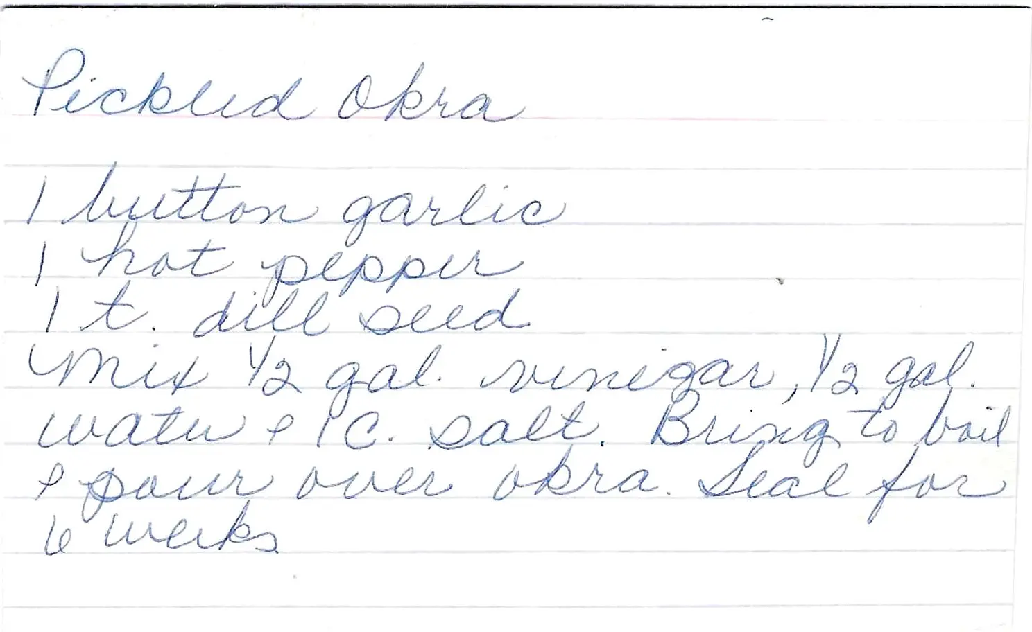 - Pour over okra, garlic, hot pepper, and dill seed.
