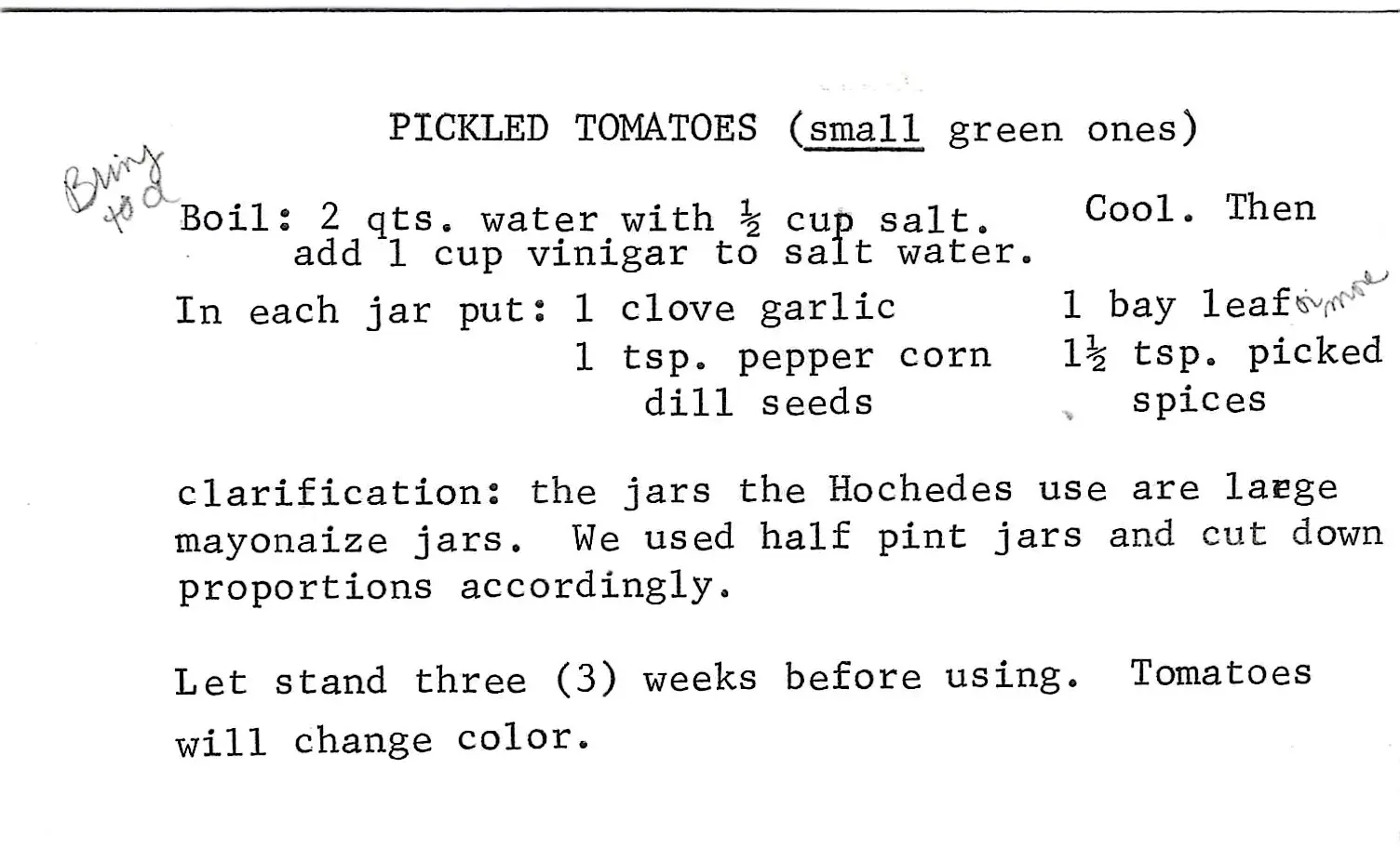 - Let stand for three weeks before using. The tomatoes will change color during this time.