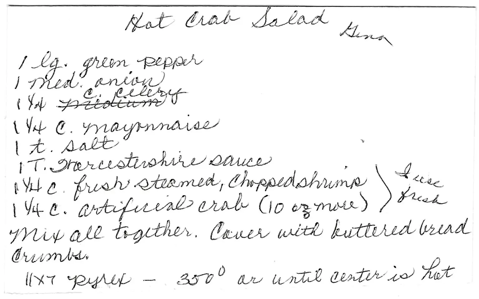- In a medium bowl, combine the chopped green pepper, onion, celery, mayonnaise, salt, Worcestershire sauce, chopped shrimp, and artificial crab meat.
