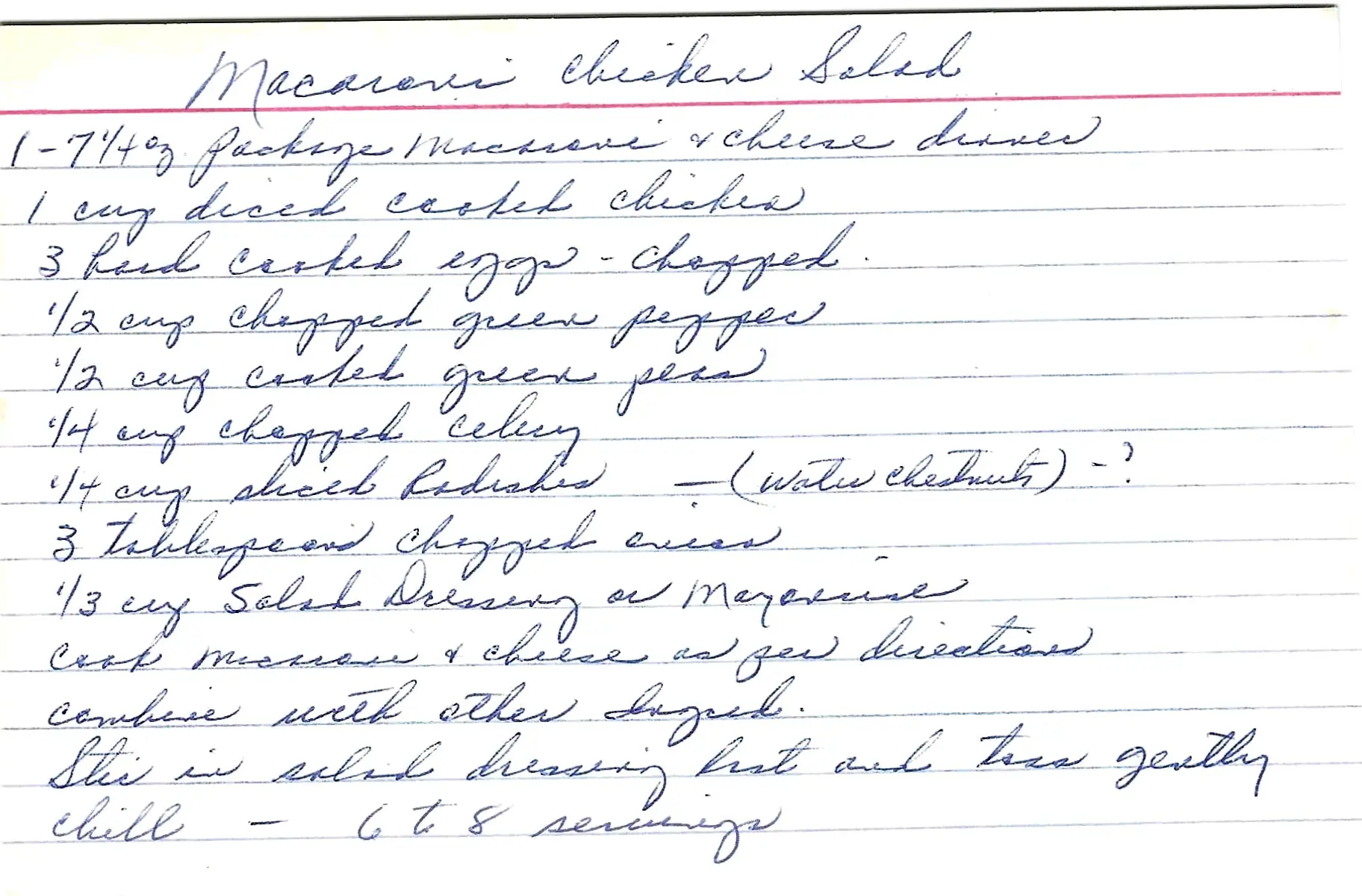 The recipe card has a handwritten note “(water chestnuts)?” next to the sliced radishes, suggesting they could be used as a substitute.