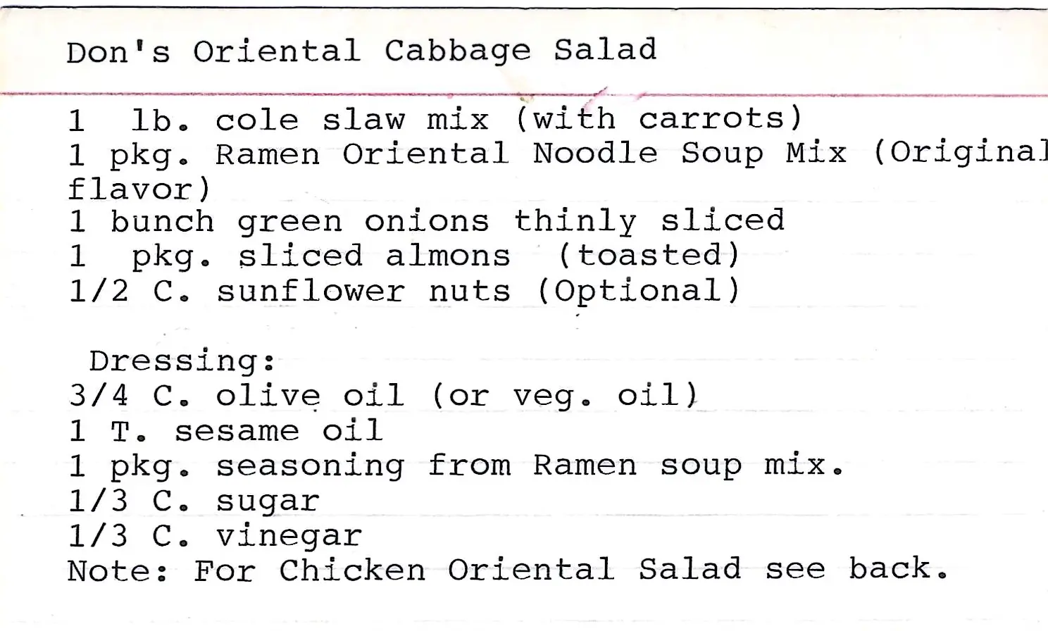 - Break up the block of uncooked Ramen noodles and add them to the salad.