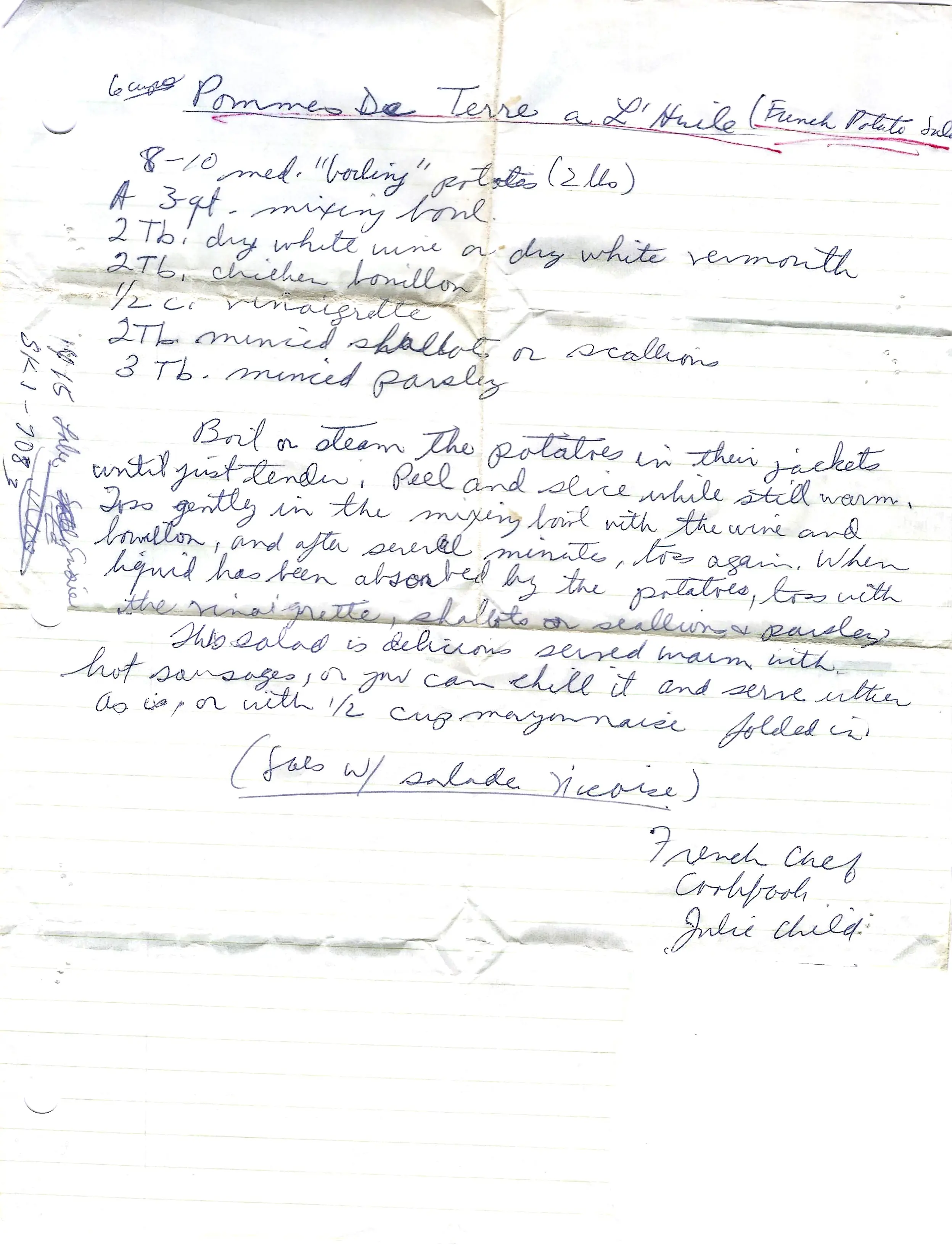This salad is delicious served warm with hot sausages. Alternatively, you can chill it and serve it cold. For a creamier version, fold in 1/2 cup of mayonnaise before chilling. The recipe card also notes that this “Goes w/ salade Nicoise.”