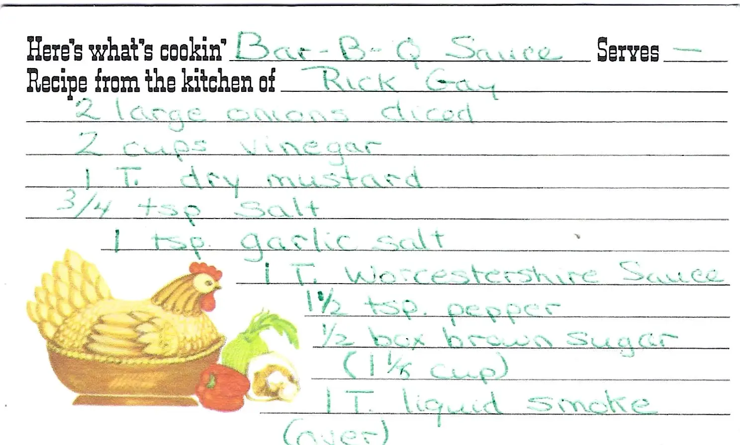 - Mix all ingredients together in a large saucepan: diced onions, vinegar, dry mustard, salt, garlic salt, Worcestershire sauce, pepper, brown sugar, liquid smoke, catsup, and red pepper (or chili powder).