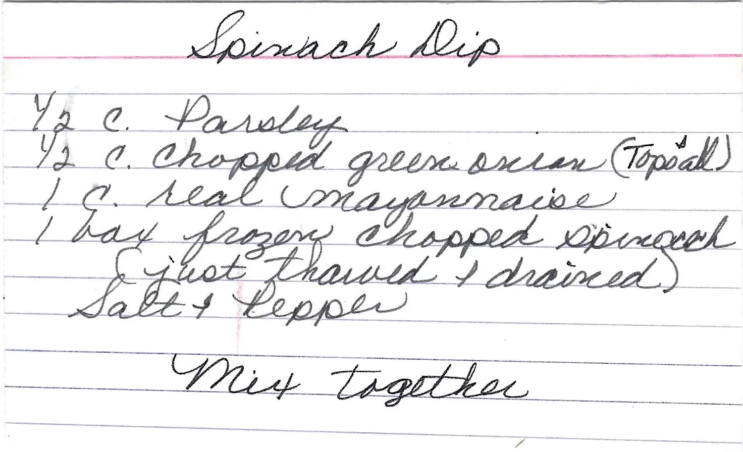 | 1 Bag | Frozen Chopped Spinach (just thawed & drained) |