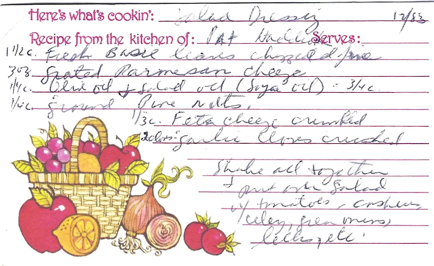 - In a jar with a tight-fitting lid, combine all the ingredients: one and a half cups finely chopped fresh basil, three ounces grated Parmesan cheese, cup olive oil, cup salad oil, cup ground pine nuts, cup crumbled feta cheese, and two crushed garlic cloves.