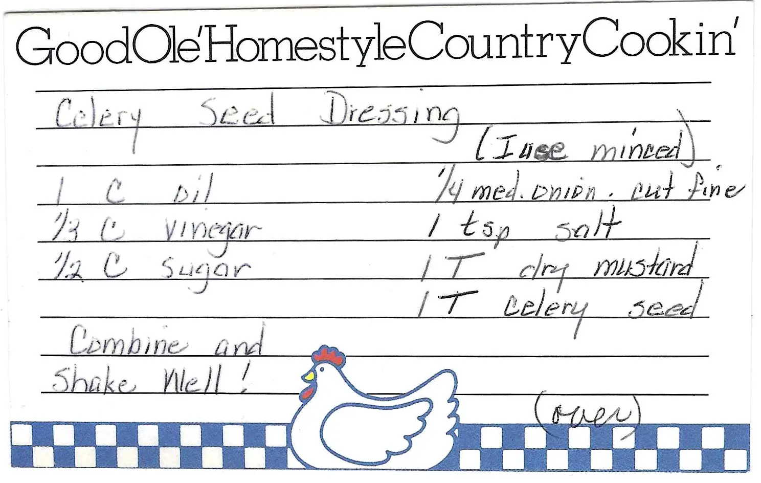 - Combine Oil, Vinegar, Sugar, Onion, Salt, Dry Mustard, and Celery seed.