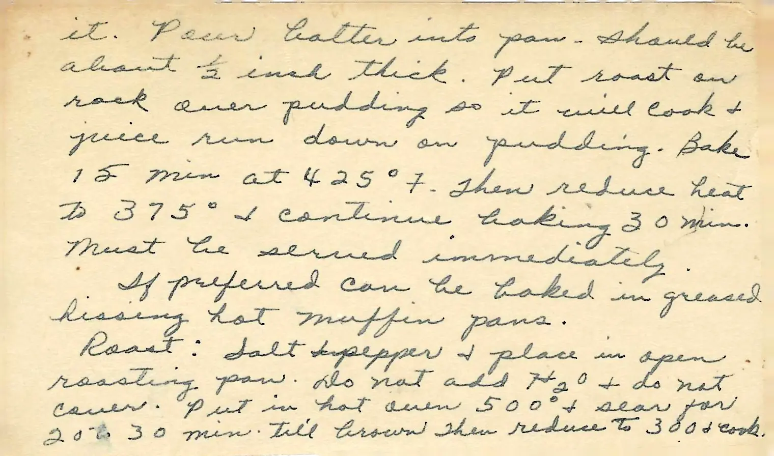 - Put roast on rack over pudding so it will cook & juice run down on pudding.