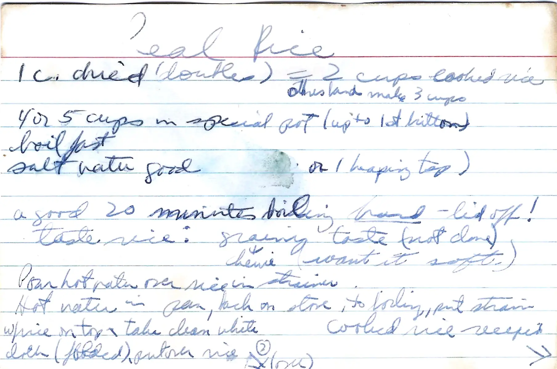- Cover the pot, reduce heat to low, and let the rice steam. (The card notes this “Makes each rice indiv. Keeps hits dry” and “keeps for 2 hours”).
