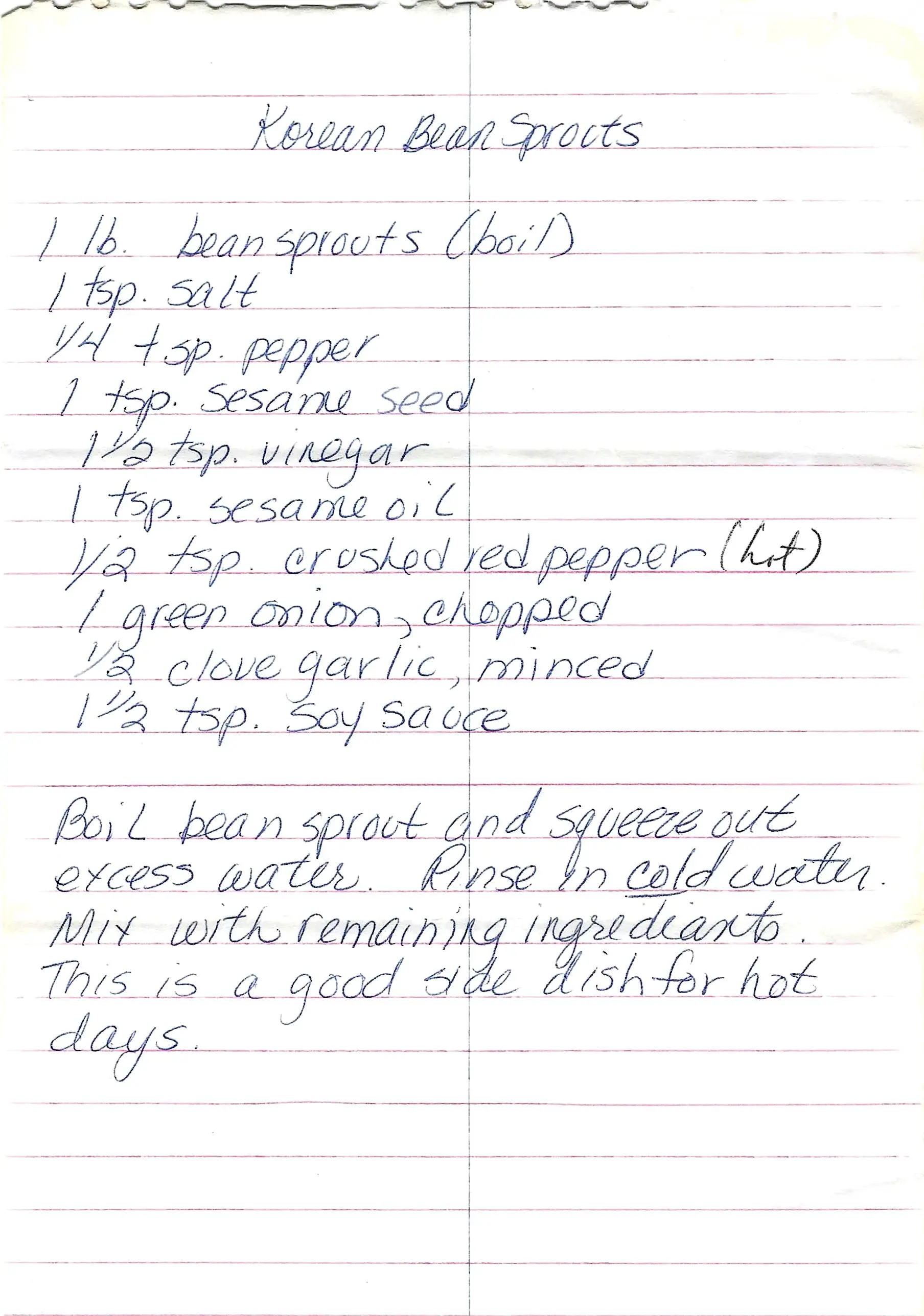 - Mix with remaining ingredients (salt, pepper, sesame seed, vinegar, sesame oil, crushed red pepper, chopped green onion, minced garlic, soy sauce)