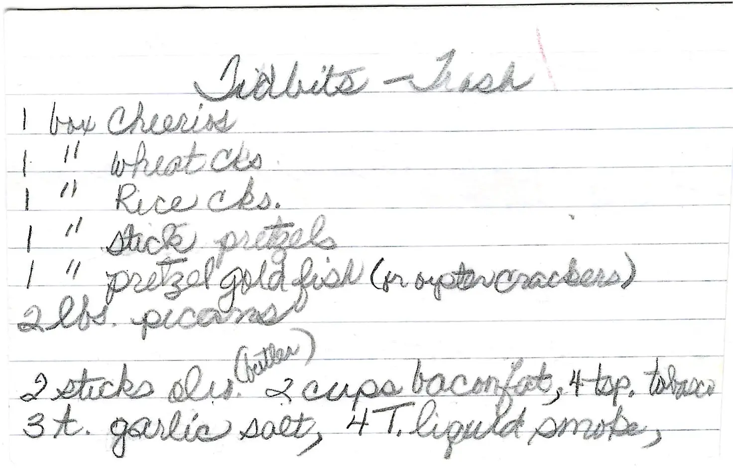 - In a large, clean plastic bag, toss together the Cheerios, Wheat Chex, Rice Chex, stick pretzels, pretzel Goldfish (or oyster crackers), and pecans.