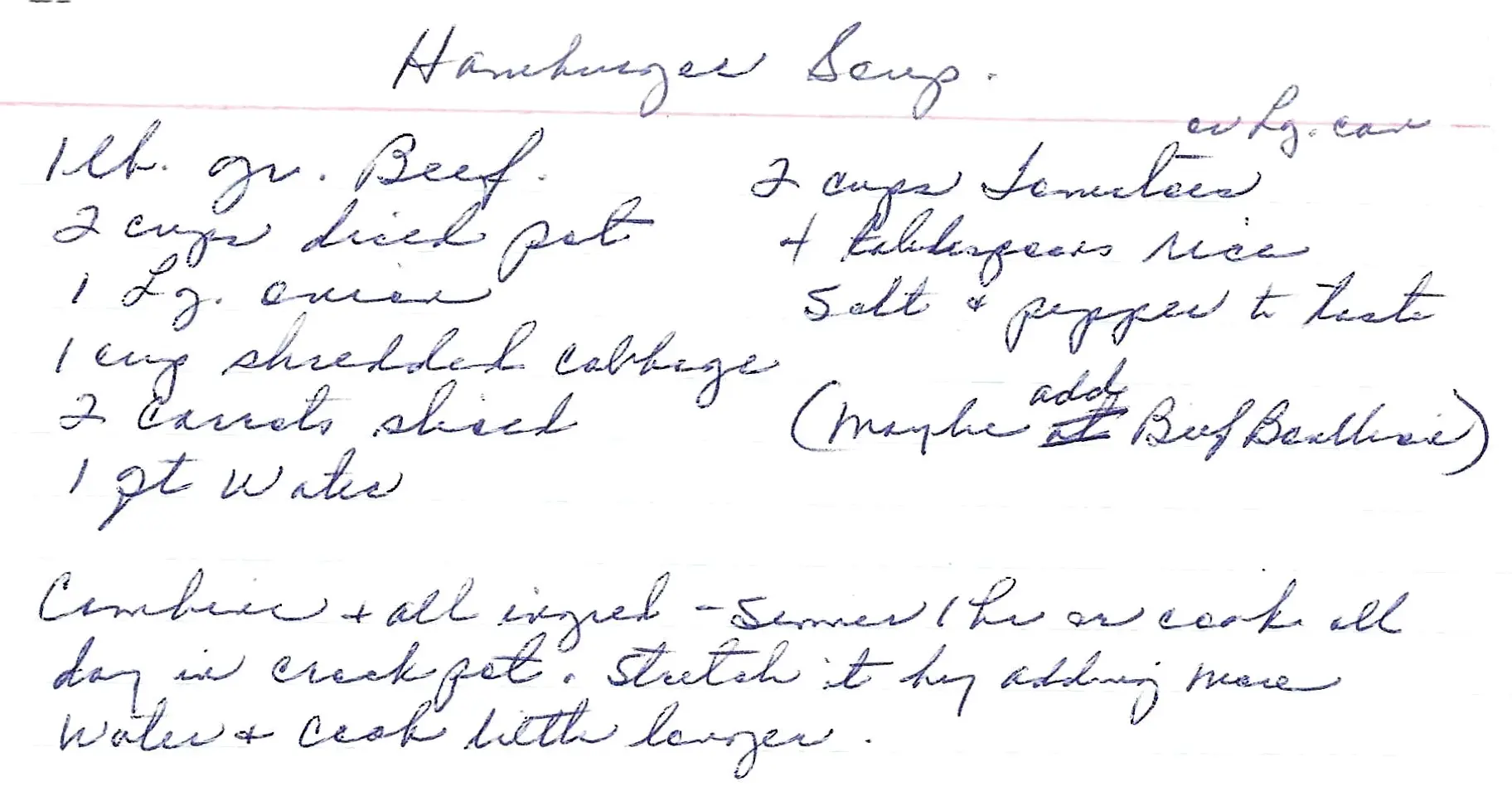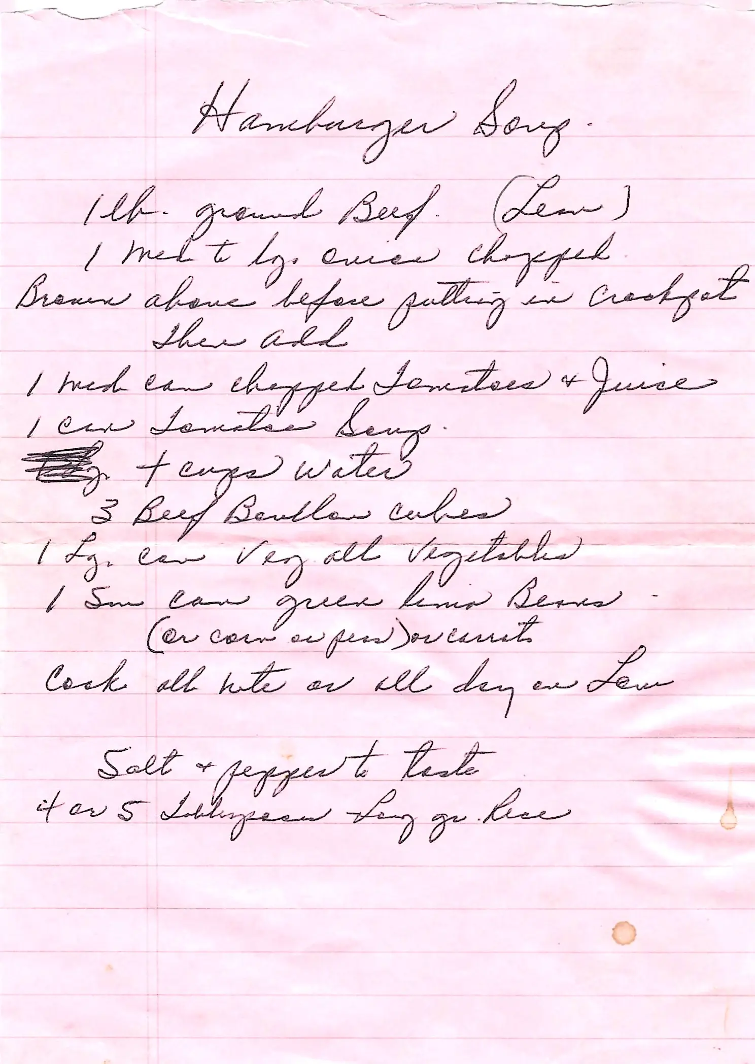 The ingredient “4 cups water” was crossed out on the original recipe card, likely because the tomato juice and soup provide enough liquid.d.