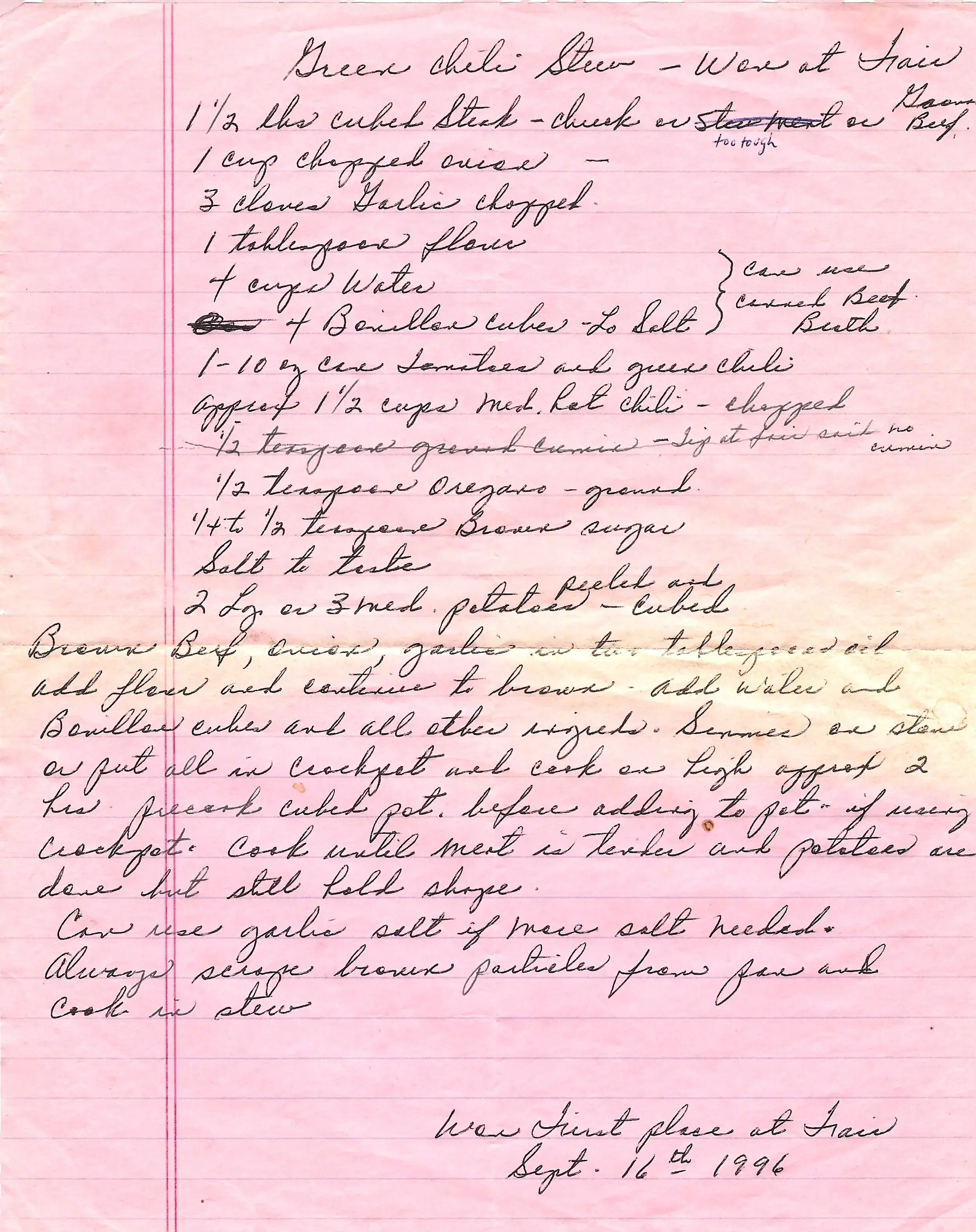 This recipe won first place at the Fair on September 16th, 1996. The author advises to always scrape the browned particles from the bottom of the pan and cook them in the stew for extra flavor. They also note that you can use less cumin if you prefer, and to use garlic salt only if more salt is needed at the end.