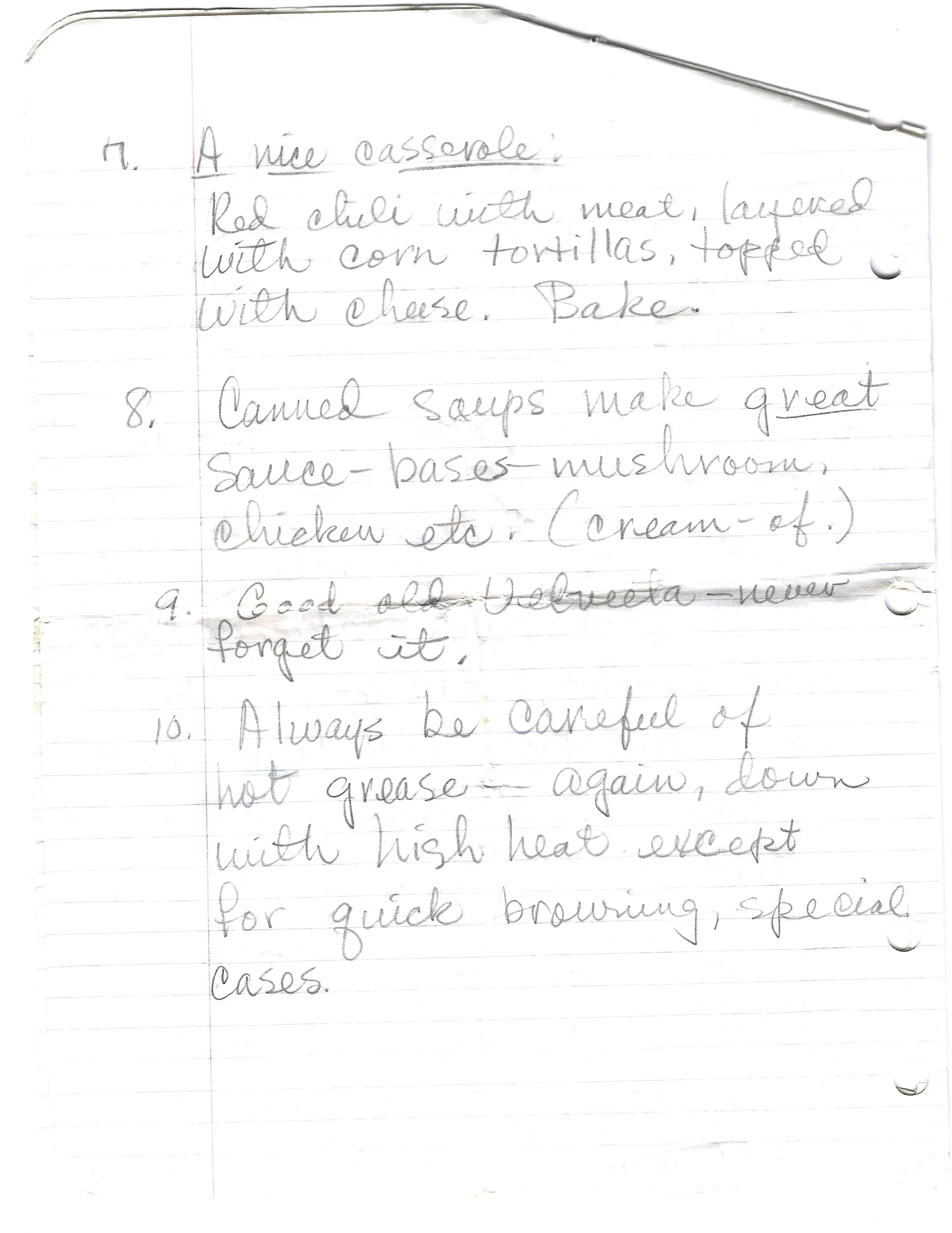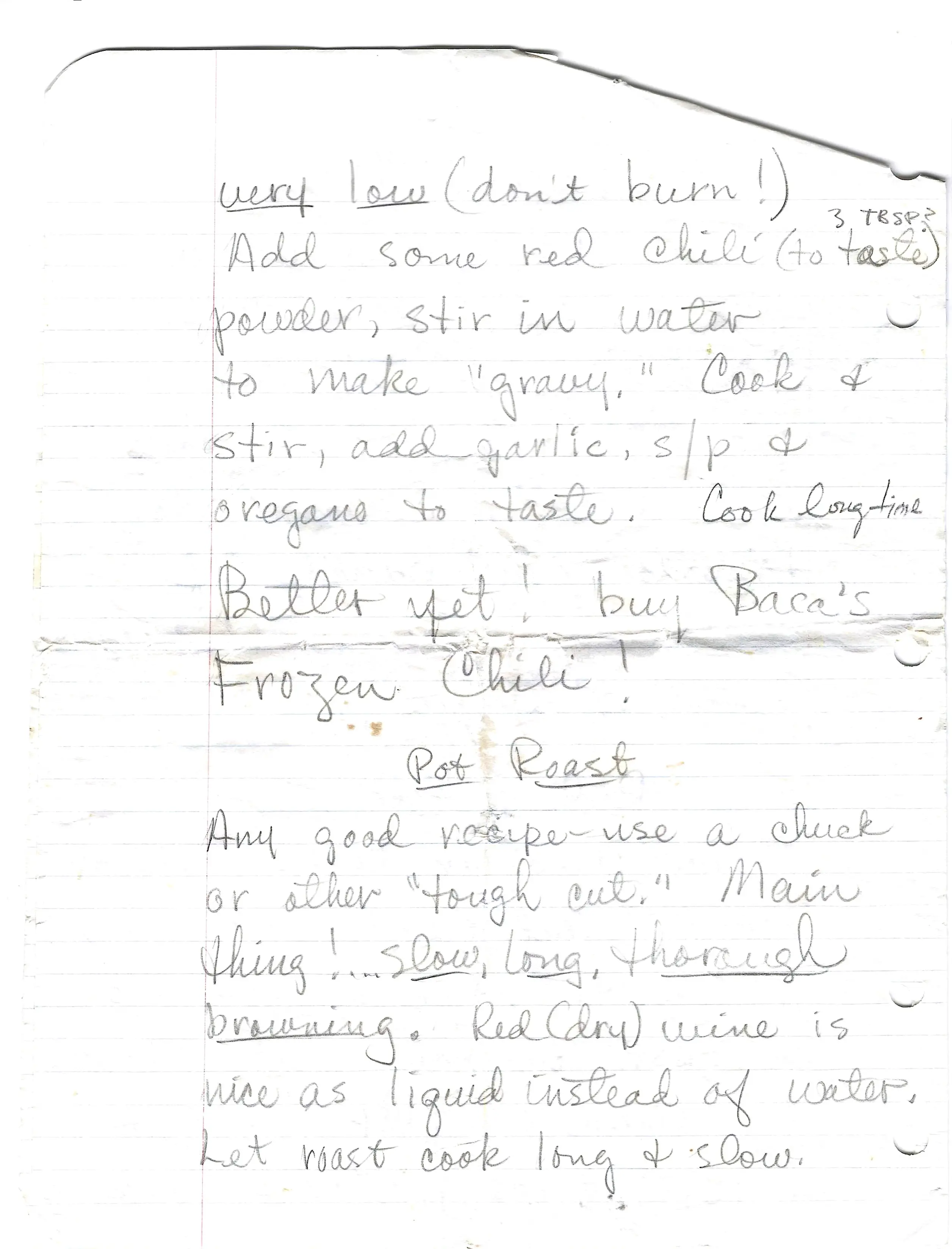 The recipe mentions pinto beans, likely as an optional addition. It also lists “2 doz ch” and “4 fresh toms,” possibly referring to using fresh tomatoes instead of canned.