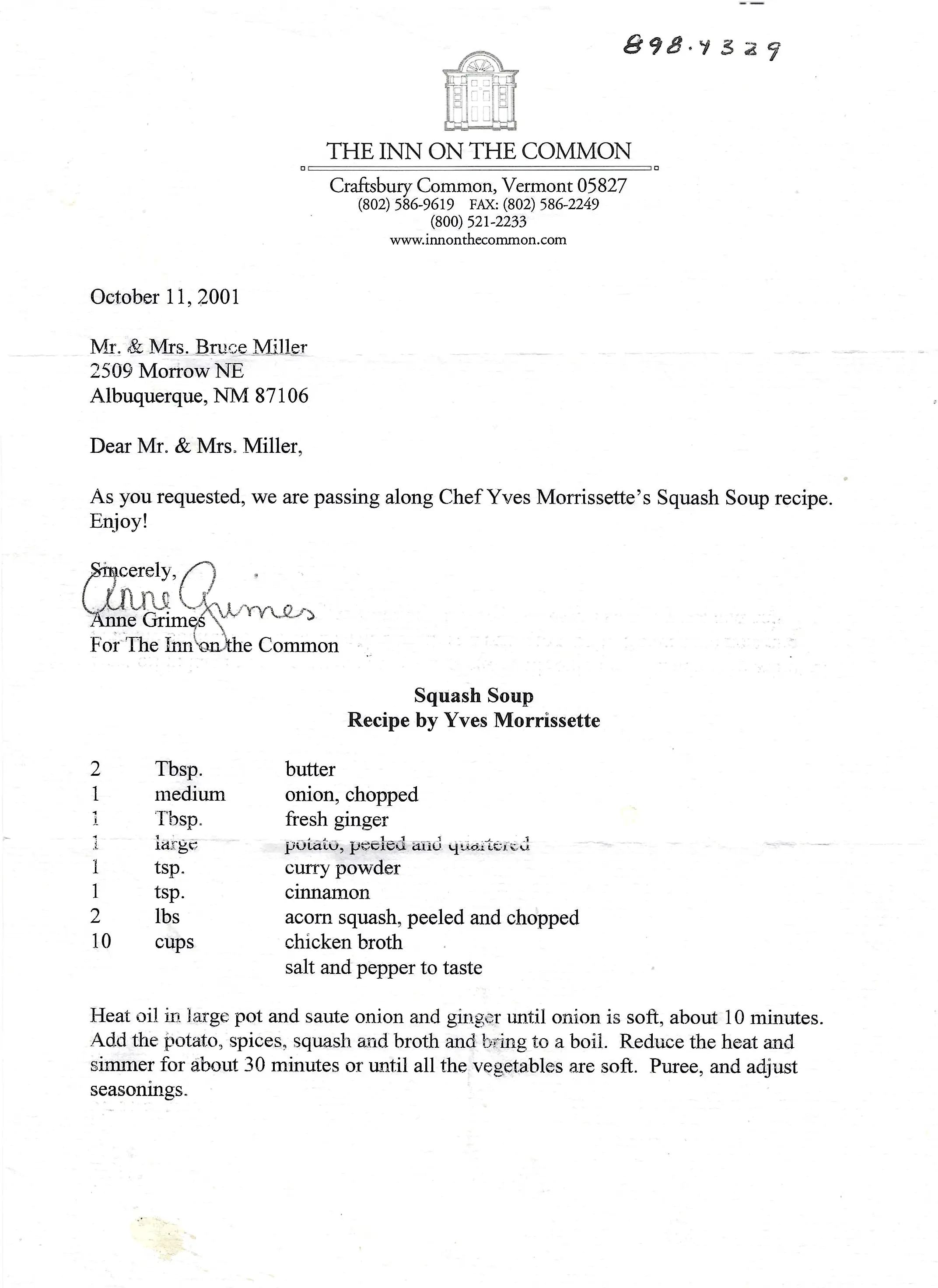 This recipe was sent in a letter from Anne Grimes of “The Inn on the Common” in Craftsbury Common, Vermont, to Mr. & Mrs. Bruce Miller on October 11, 2001. The ingredients list butter, but the instructions mention heating oil; either would work for sautéing.