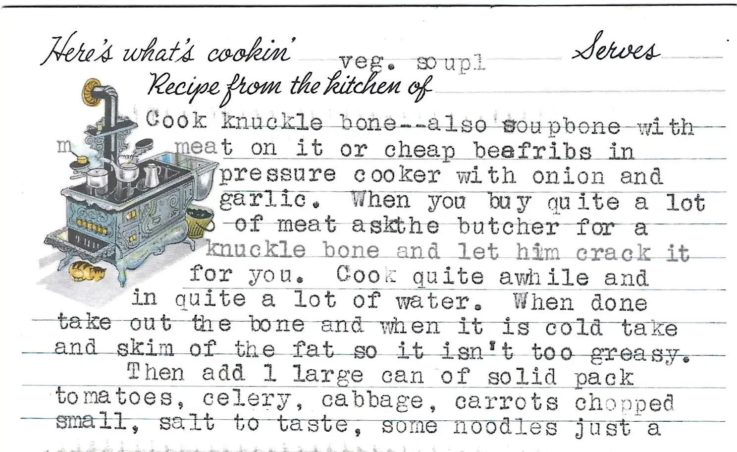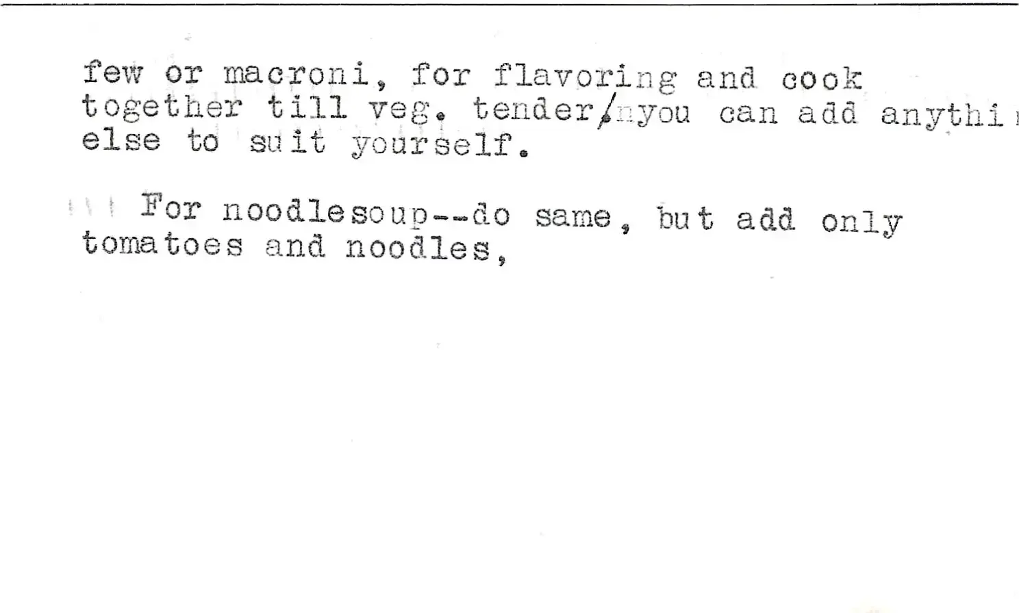 “you can add anything else to suit yourself.” A variation for a simpler “noodle soup” is also mentioned: follow the same broth-making process but add only tomatoes and noodles.